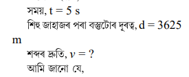 20. শিহু জাহাজত সংযুক্ত চনাৰ সঁজুলি এটাই সংকেত প্ৰেৰণ কৰাৰ 5s পিছত প্রতিধ্বনি ধৰা পেলালে। শিহু জাহাজৰ পৰা বস্তুটোৰ দূৰত্ব 3625 m হ’লে পানীত শব্দৰ দ্রুতি নিৰ্ণয় কৰা।