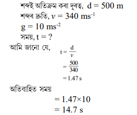 13. 500 m ওখ স্তম্ভ এটাৰ শীৰ্ষৰ পৰা শিল এটা স্তম্ভৰ পাদদেশত থকা পুখুৰীৰ পানীত পৰিবলৈ দিয়া হ’ল। পানীত পৰাৰ শব্দটো স্তম্ভটোৰ শীৰ্ষত কেতিয়া শুনিবলৈ পোৱা যাব? দিয়া আছে g = 10 ms-² আৰু শব্দৰ দ্রুতি = 340 ms-¹