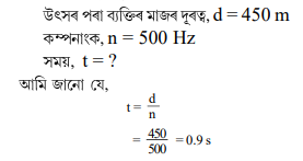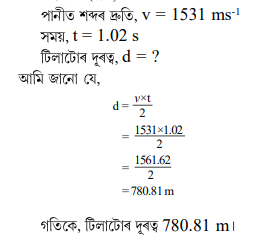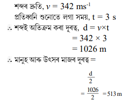 1. শব্দ এটাৰ প্ৰতিধ্বনি 3 পিছত শুনা গ’ল। প্রতিফলক পৃষ্ঠ আৰু উৎসৰ মাজৰ দূৰত্ব কিমান? দিয়া আছে, শব্দৰ দ্রুতি 342 ms-¹।
