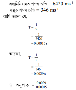 ৪. এলুমিনিয়ামৰ দণ্ড এডালৰ দুই মুৰত দুজান ছাত্র আছে। এজনে শিলগুটিৰে দণ্ডডাল টুকুৰাই দিলে। শব্দ বায়ু আৰু এলুমিনিয়ামৰ মাজেৰে গৈ ইজন ছাত্ৰৰ ওচৰ পাওঁতে লগা সময়ৰ অনুপাত উলিওৱা।
