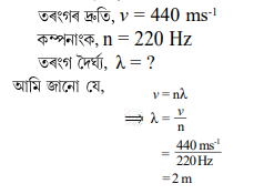 উত্তৰঃ শব্দৰ দ্রুতি হ’ল সংকোচন বা তনুভৱনৰ বিন্দু এটাই প্রতি একক সময়ত অতিক্ৰম কৰা দূৰত্ব। তৰংগ দৈর্ঘ্য হ’ল এটা পর্যায়কালত শব্দই অতিক্রম কৰা দূৰত্ব। গতিকে, তৰংগৰ কম্পানংক (n), তৰংগ দৈর্ঘ্য (λ) আৰু দ্রুতি (v) ৰ মাজৰ সম্পৰ্ক হ’ল-