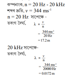 7. ব্যক্তি এজনৰ শ্রাব্য সীমাৰ পৰিসৰ 20 Hz – 20kHz ৰ ভিতৰত। এই দুটা তৰংগ কম্পনাংকৰ সাপেক্ষে শব্দ তৰংগৰ বায়ুত প্রাৰূপিক তৰংগ দৈর্ঘ্য কিমান? বায়ুত শব্দৰ দ্রুতি 344 m/s বুলি ধৰা।