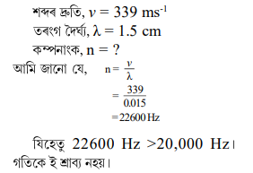 14. শব্দ তৰংগ এটা 339 ms-¹ দ্রুতিবে সঞ্চালিত হৈছে। যদি ইয়াৰ তৰংগ দৈর্ঘ্য 1.5 cm, তেন্তে তৰংগটোৰ কম্পনাংক কিমান? ই শ্রাব্য হ’বনে?